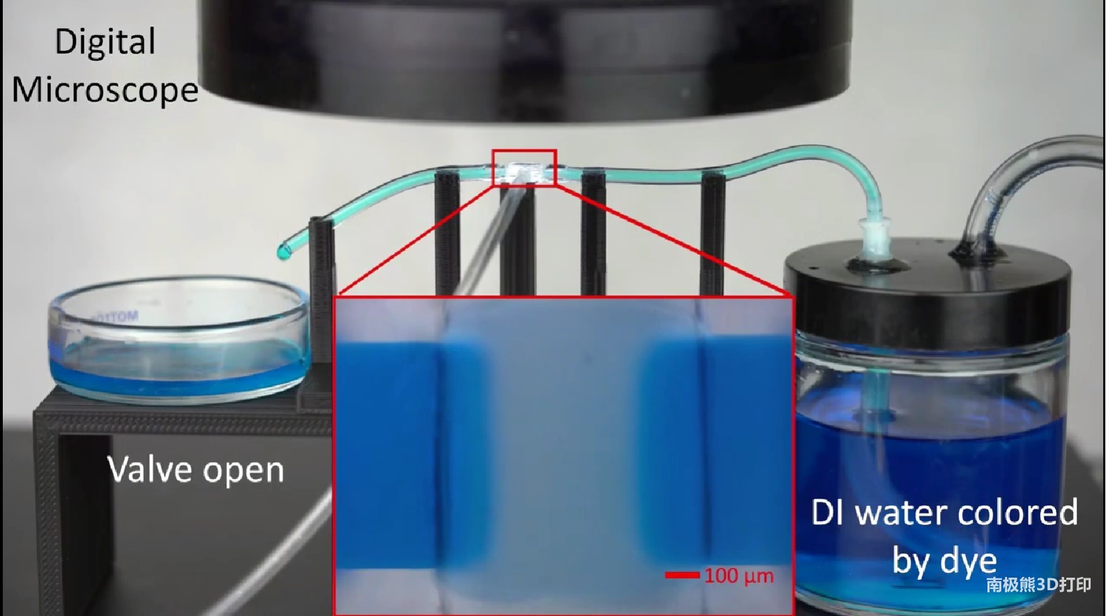 為了在適合微流控設備的微觀層面上準確地在透明樹脂中創(chuàng)建通道,該團隊開發(fā)了一個獨特的輔助平臺,該平臺在光源和打印設備之間移動,阻擋光線使通道壁內(nèi)的液體凝固,這樣就可以在設備的頂部單獨添加通道頂。殘留在通道內(nèi)的樹脂仍將處于液體狀態(tài),然后可以在打印完成后被沖出,形成通道空間。