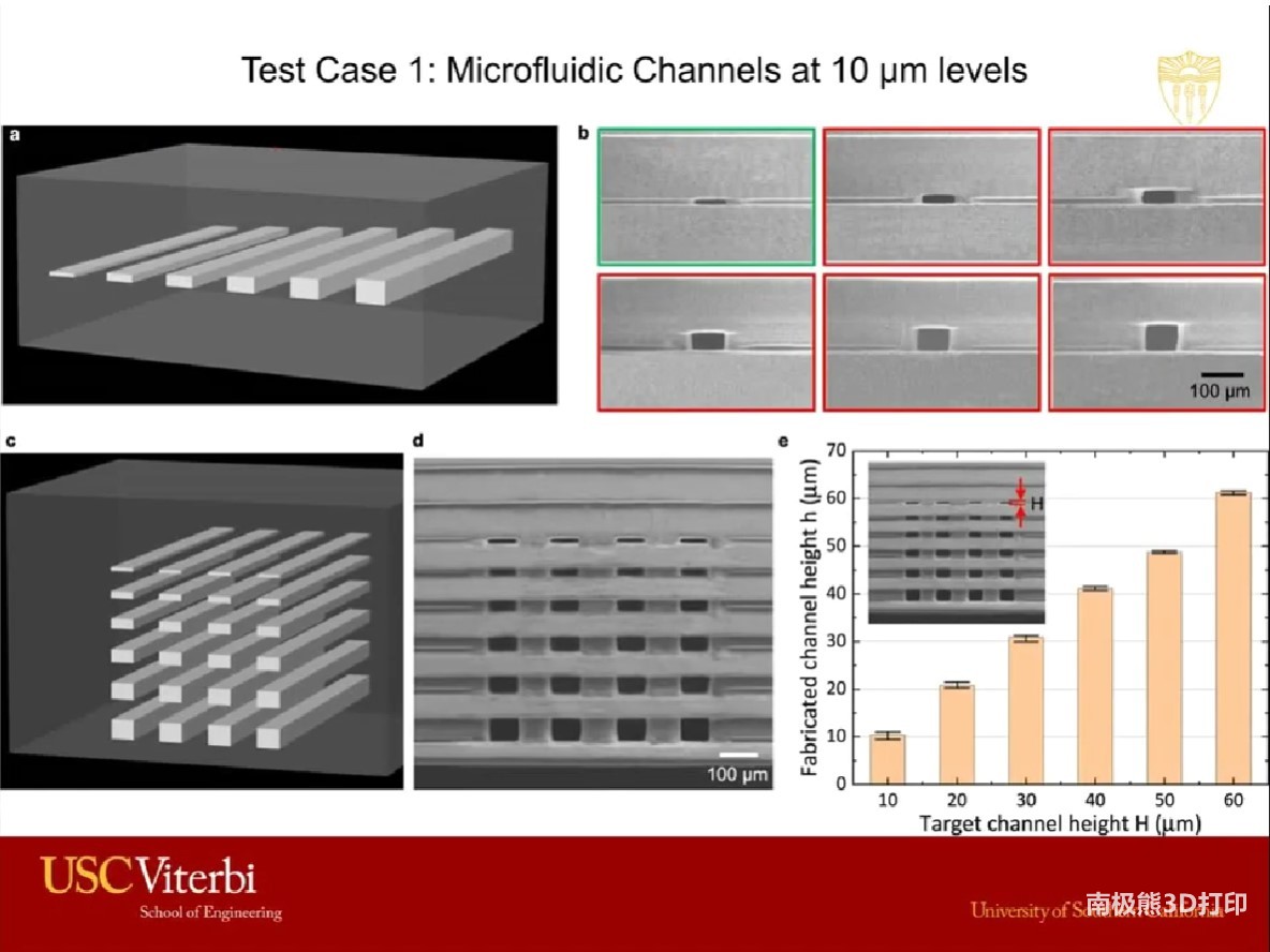 Chen說:"在光投射之后,我們基本上可以決定在哪里構建(芯片的)部件,由于我們使用的是光投影技術,所以在一個層內(nèi)的分辨率可以相當高。然而,層與層之間的分辨率要差得多,這是構建微尺度通道的一個關鍵挑戰(zhàn)。這是我們第一次能夠打印出通道高度為10微米水平的結構,而且做到了真正的精準控制,誤差為±1微米。這是以前從未做過的事情,所以這是微通道3D打印的一個突破"。