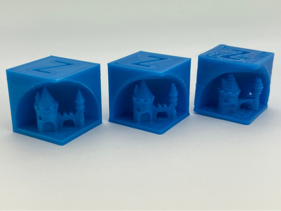 △這些3D打印的立方體展示了打印速度是如何影響零件質(zhì)量的。從左到右,20毫米立方體分別用0.2毫米、0.4毫米和1.0毫米噴嘴打印;層高等于每個(gè)噴嘴孔直徑的50%。構(gòu)建時(shí)間分別為分別為13分鐘、37分鐘和8分鐘。圖片來自Micro Swiss