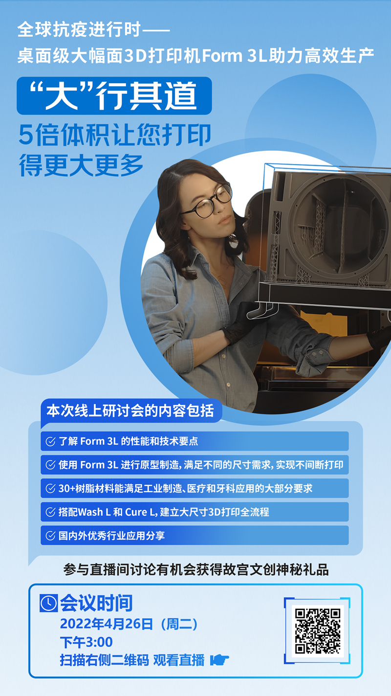 我們誠摯邀請您參加本次研討會,Formlabs 應用工程師 Tim Ye 將會在現場講解Form 3L的工作流程,如何運用3D打印進行原型制造,以及一些已經成功的應用案例。