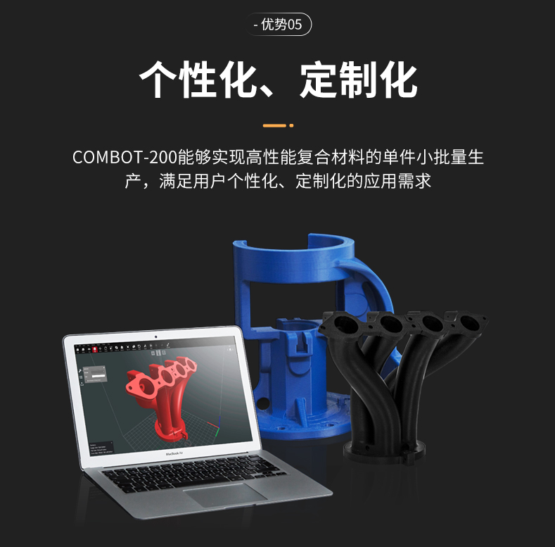 Combot 200碳纖維3D打印機,具有雙材料打印系統,兼顧高強度與輕量化,構建能力強,支持個性化定制,利用連續碳纖維與PLA材料等高性能材料性能構建出高強度復合材料零件,連續打印混合材料。