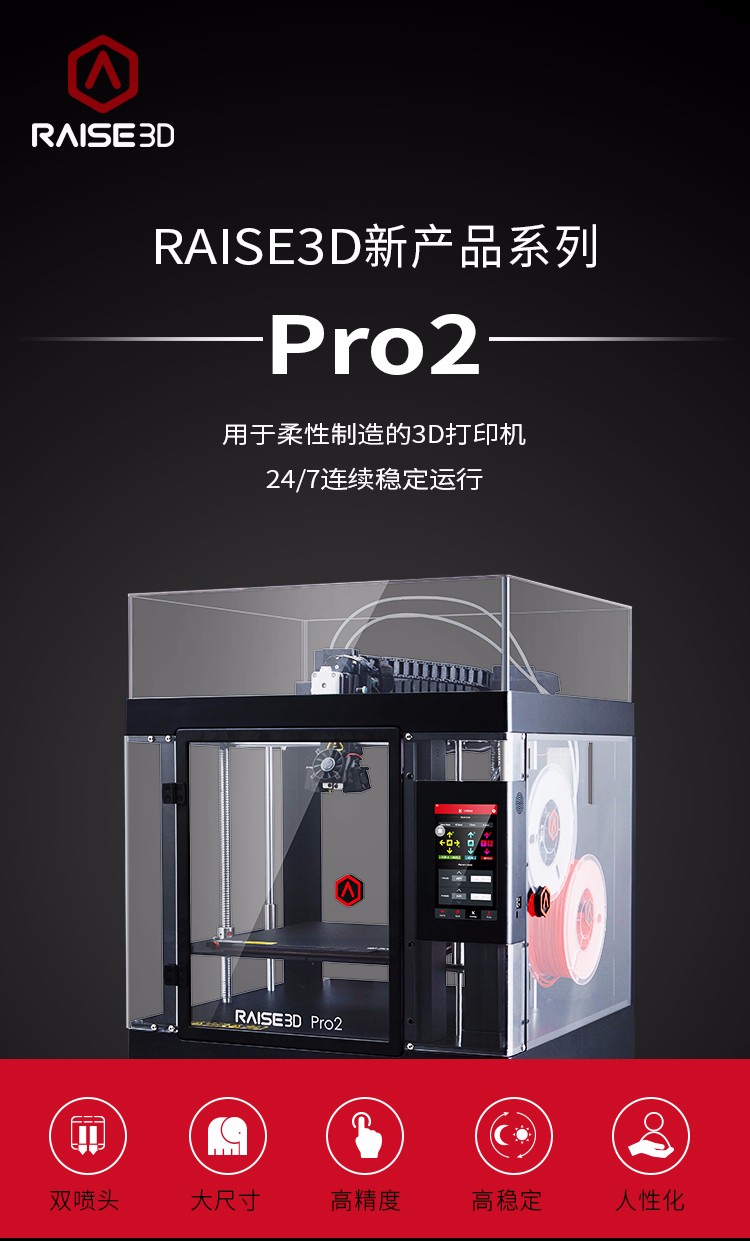 Raise Pro 2用于柔性制造的高性能3d打印機(jī),24小時穩(wěn)定運(yùn)行,速度更快,質(zhì)量更高,單雙噴頭,滿足你的高性能打印需求,電動雙噴頭擠出系統(tǒng),免調(diào)試自動平臺,小身材,大智造!